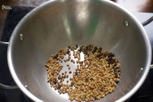 - In the same pan, next add coriander seeds and fry till the seeds become slightly dark brown. Take this aside in the same plate.