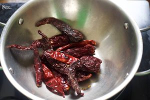 - Now, add red chili and fry the chili till it puffs up. Take it aside.