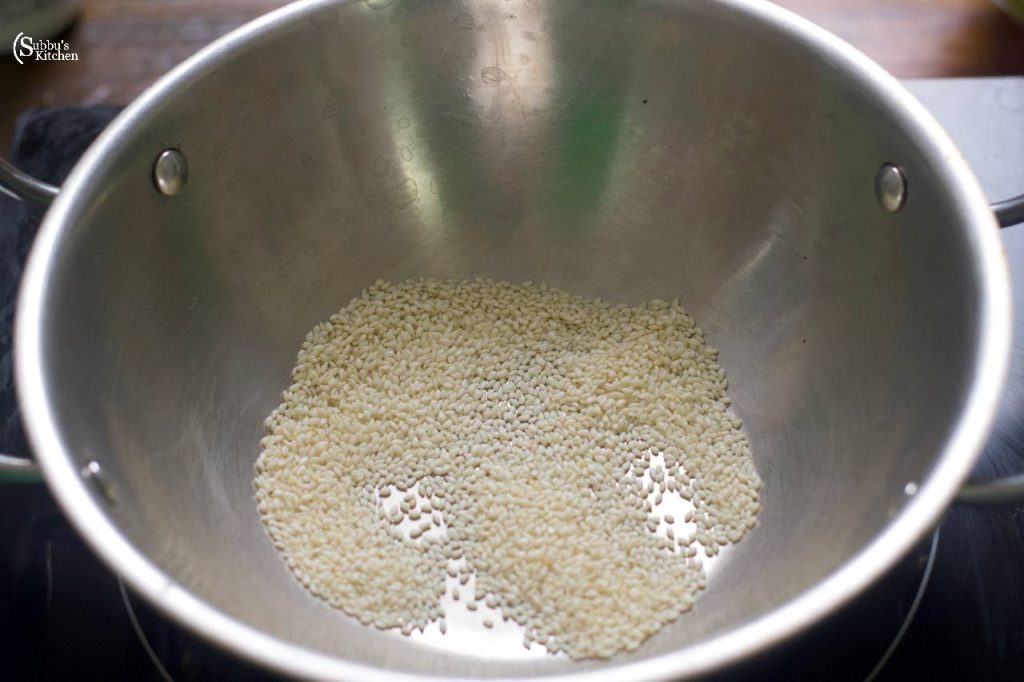 - Then, add sesame seeds and fry till it sputter. Take it aside.
