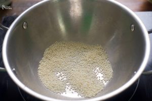 - Spread the cooked rice in a broad plate or vessel. We need to rice to cool off completely.