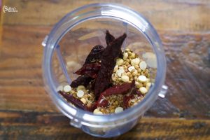 - Allow all the grinding ingredients to cool off completely and take it to mixer jar. To the grinding ingredients, add roasted gram to the mixer jar. Grind everything to a smooth powder.