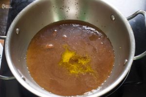 - Heat a heavy bottomed pan. Add the tamarind extract along with turmeric and salt.