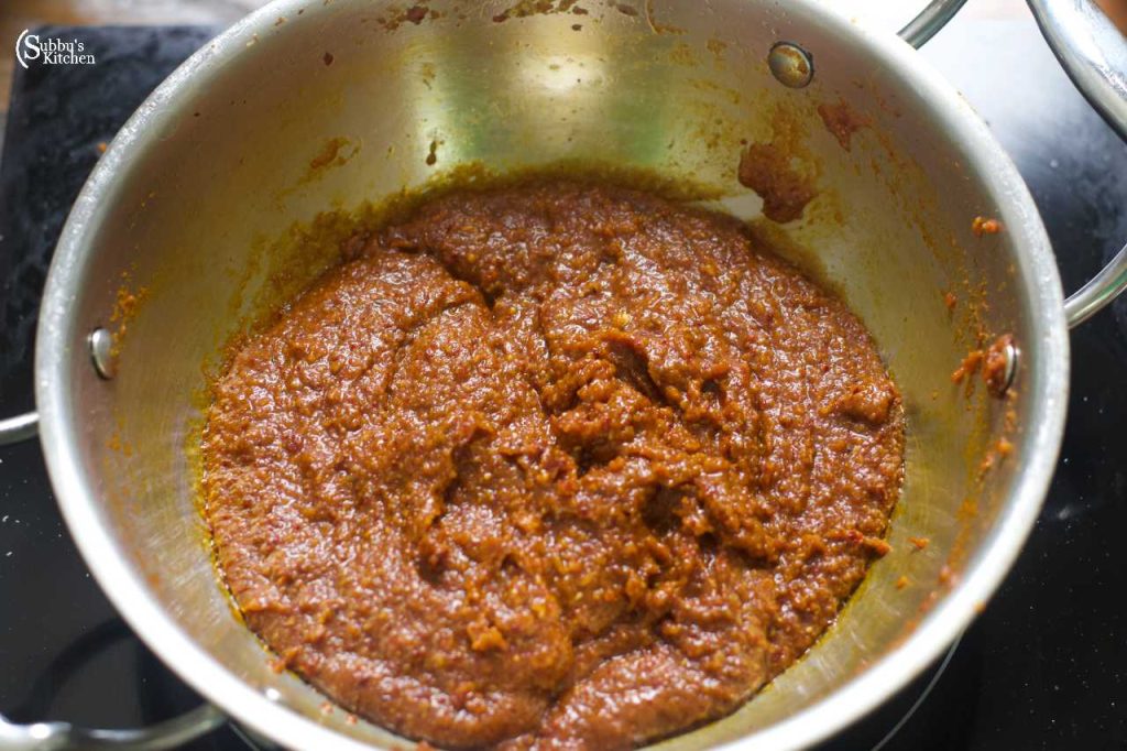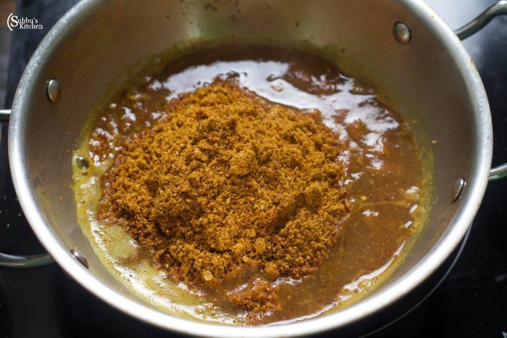 - Allow the tamarind extract to boil for 5 mins to get rid the raw smell of tamarind juice. Add the ground puliyogare spice powder to the boiling tamarind and give a good mix so it gets nicely incorporated with the tamarind juice.