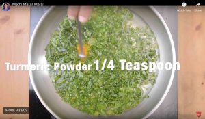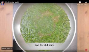 - Heat a cup of water and add the chopped fenugreek leaves (methi) along with turmeric powder and allow it to boil and cook for 3-4 mins. Drain the water and take it aside. If you like the bitterness of fenugreek then you can use the water without draining it