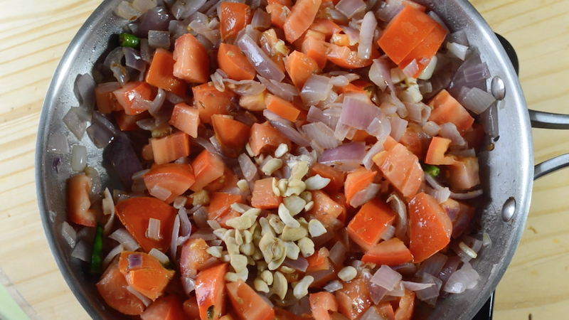 - Add green chilli, cashews, almonds and mix well. Add salt and allow the tomatoes to cook till they are mushy.