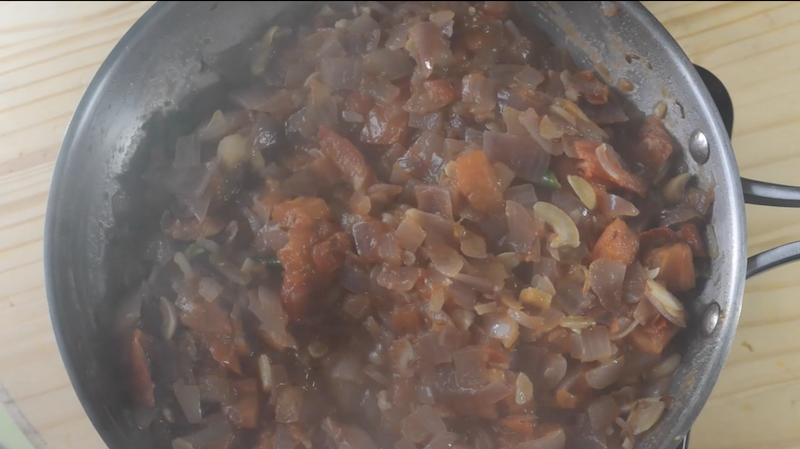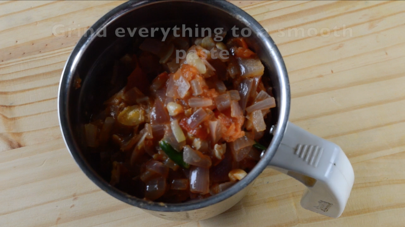- Then, allow the onion-tomato mixture to cool down completely. Take it to mixer and grind it to a smooth paste. The onion-tomato gravy ready