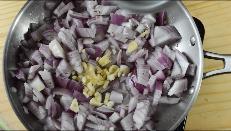 - Heat oil in a pan. Add cumin seeds and allow it to sputter. Add chopped onions
