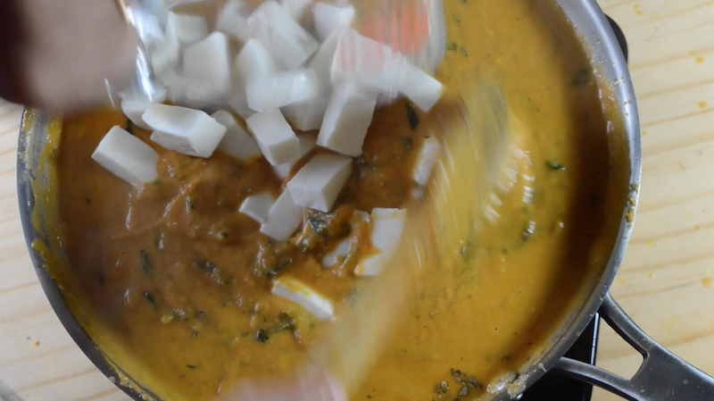 - Add water to adjust the consistency. Also crush kasoori methi and add it to gravy. Also add cubed paneer and give a good mix