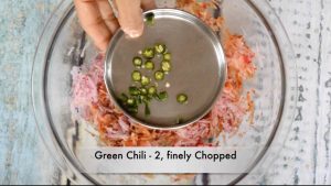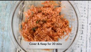 • Take grated radish in a mixing bowl. To the grated radish, add garam masala, coriander powder, red chili powder. salt, ajwain seeds and mix well. Cover & Keep it aside for 30 mins