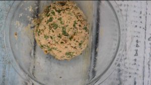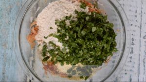 • After 30 mins, the grated radish would have released lots of moisture. Add wheat flour, garam flour. radish greens and knead well to a soft dough