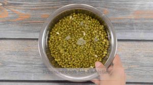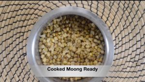 - Wash and soak Green moong in water for about 3 hours. After 3 hours, drain water, add salt and water to soak moong and pressure cook for 3 whistles