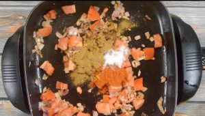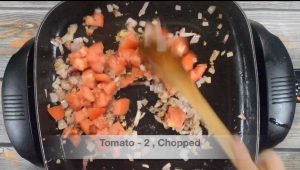 - Then add chopped tomatoes. Along with tomatoes, we need to add salt, coriander powder, red chili powder and turmeric power and mix well