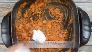 - Then add 1 cup of water and cook the masala till the oil /ghee starts to ooze out. Then add curd and give a good mix.