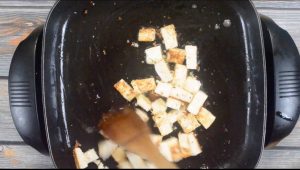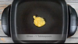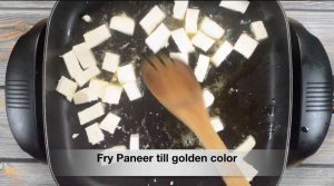- Heat 1 tablespoon of ghee in a pan. Add paneer cubes and fry the paneer till its golden brown.