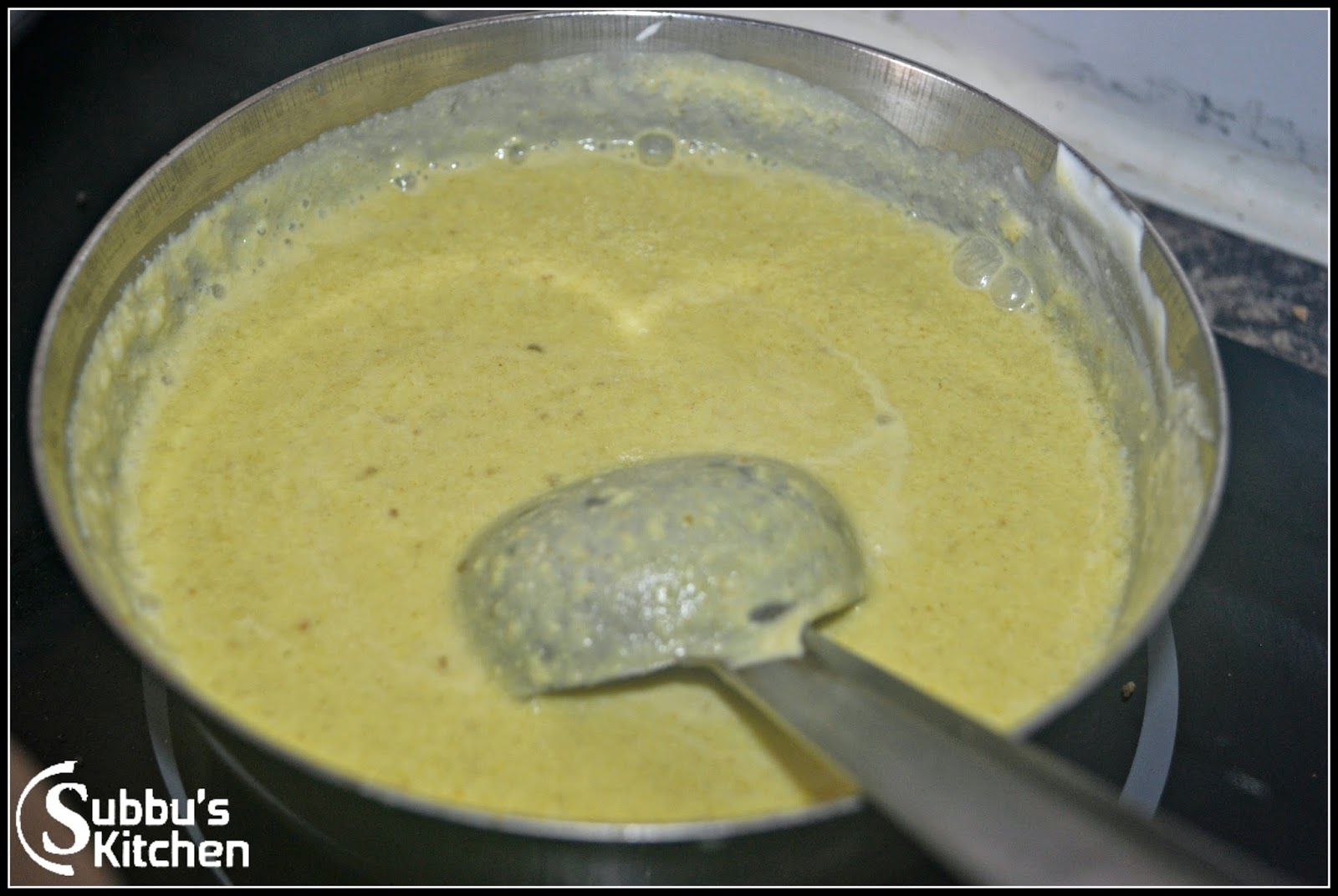 - Don't let the buttermilk boil. We should switch off the flame as soon as you see the kuzhambu is about to boil.
