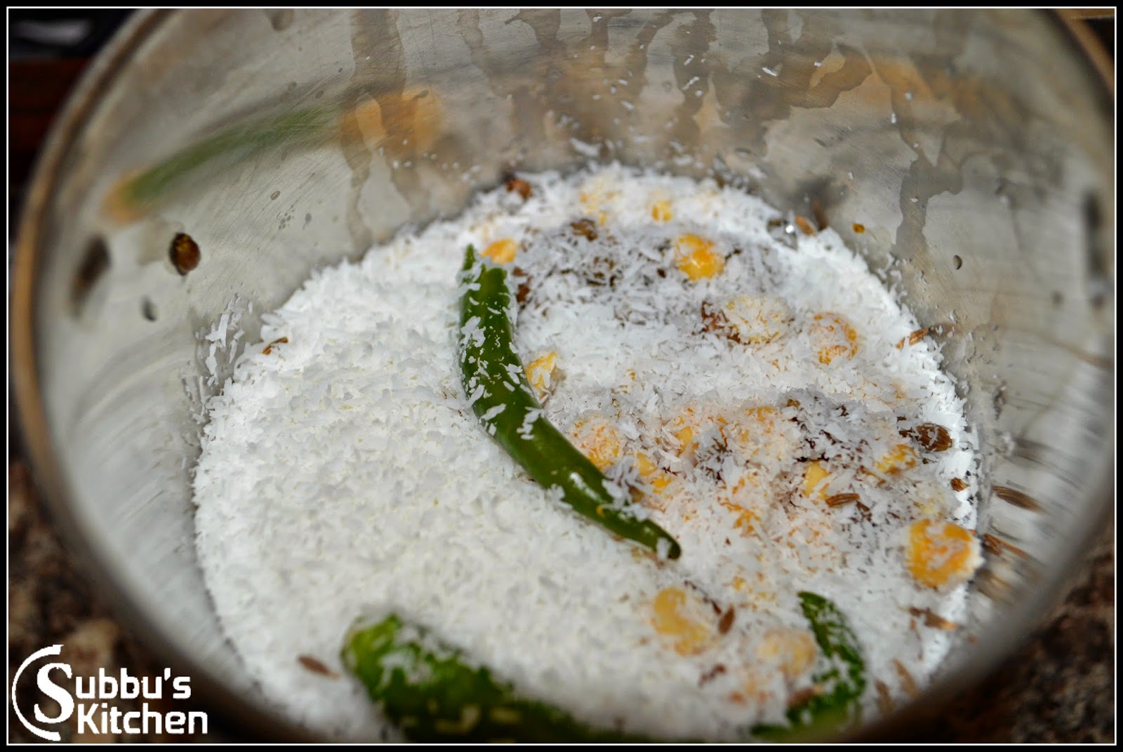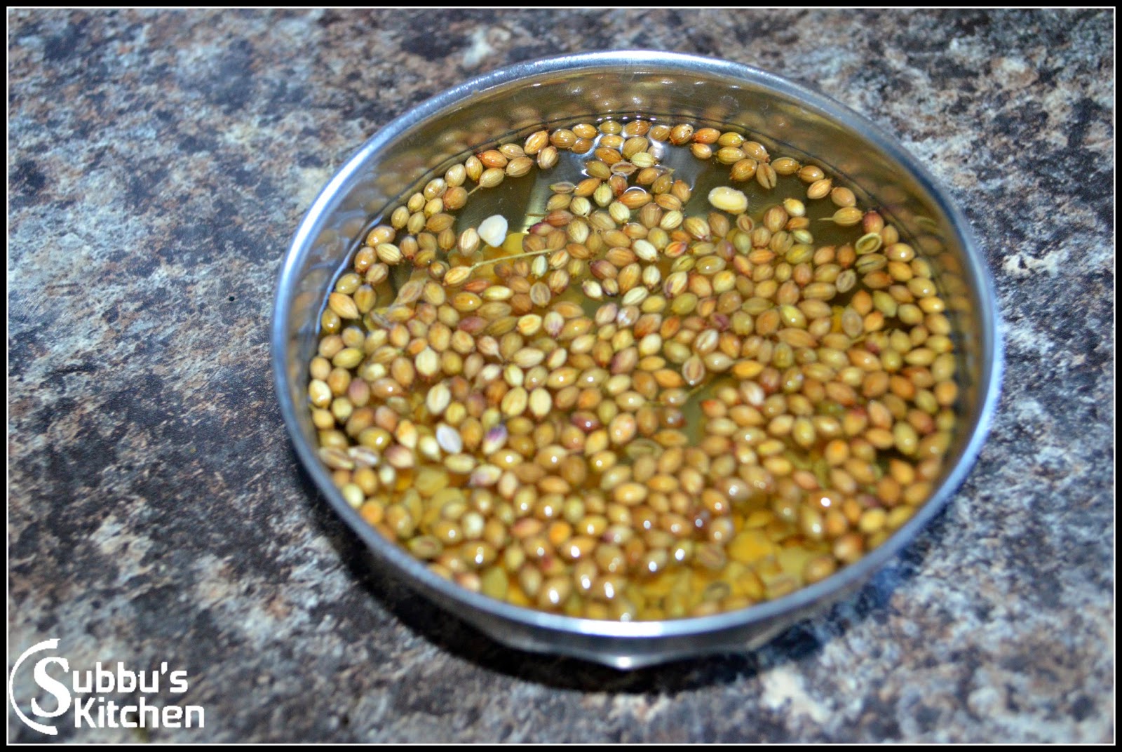 - Soak the coriander seeds, channa dal in water for 10 minutes. Heat oil in a pan and add mustard seeds. When the mustard seeds starts to sputter, add curry leaves and then fry for 5 seconds