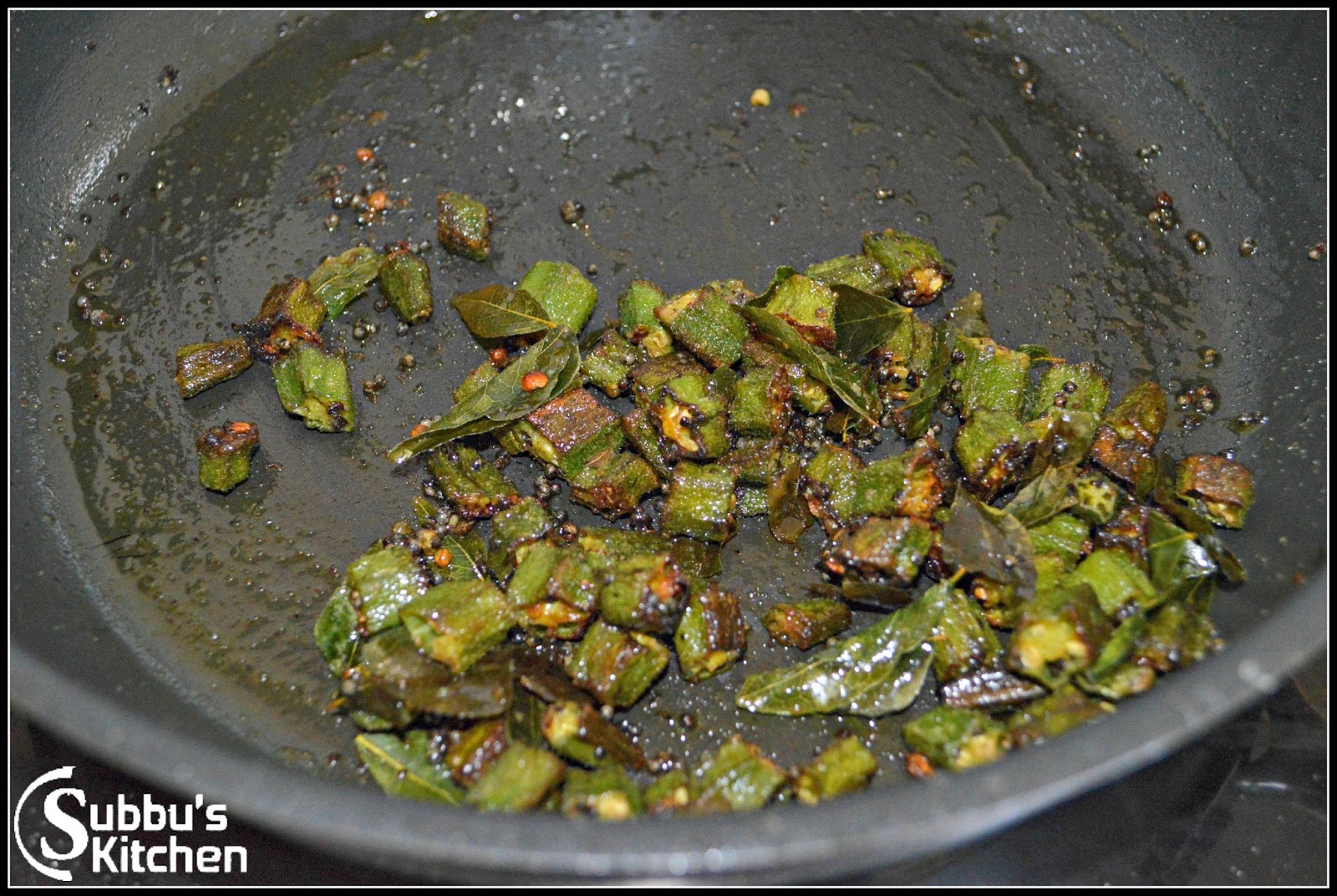 - Then add chopped ladysfinger along with salt and turmeric powder and mix well and stir -fry them nicely and remove from flame. Please note that the salt that we are adding here for only the ladysfinger so adjust the salt accordingly. The salt for the Kuzhambu will be added at the last step.