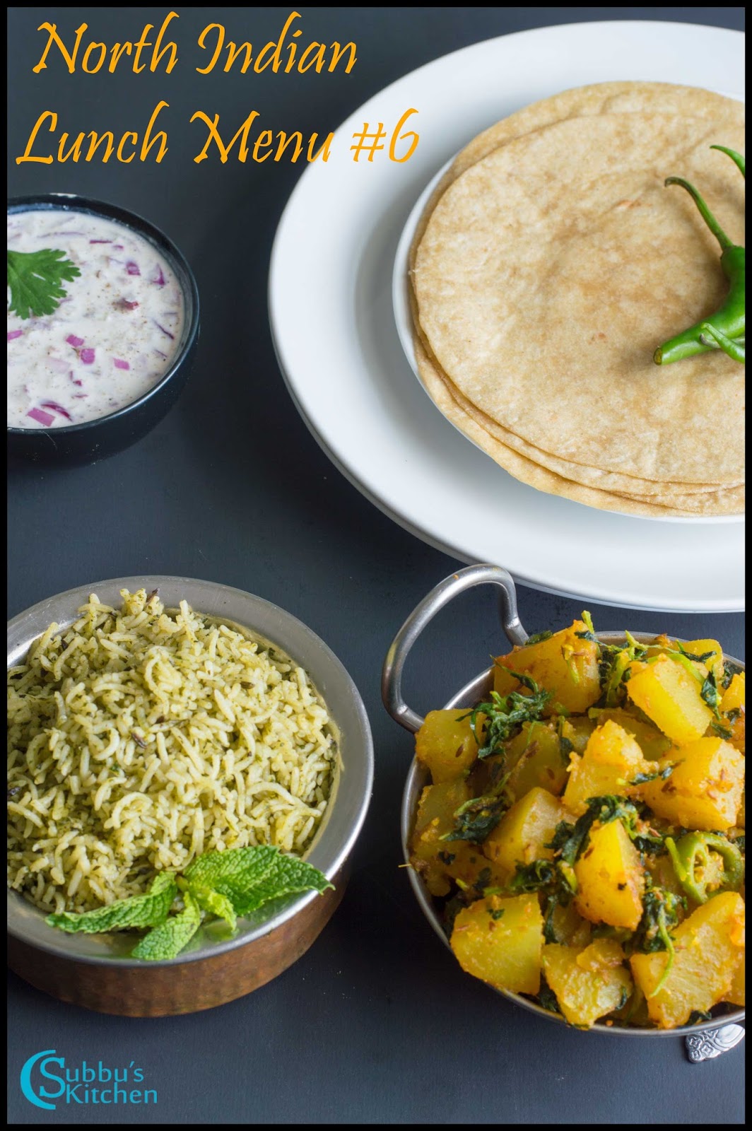 | NorthIndian Lunch Menu #6 - Aloo Methi, Roti, Mint Pulao, Onion Raitha |