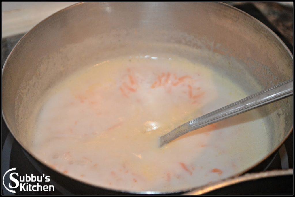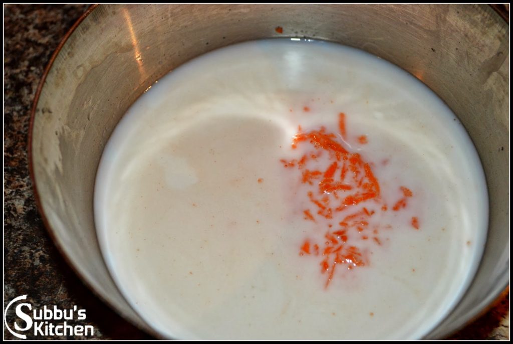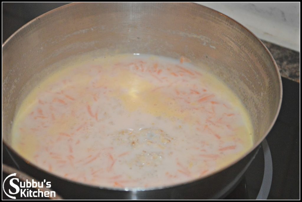 - Meanwhile wash and peel the skin of carrot and grate it. Take a vessel, and add the remaining milk and the grated carrot