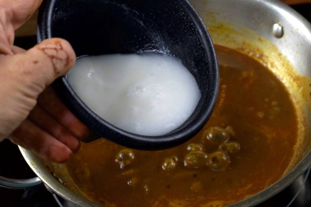 - Add this rice flour paste to the kuzhambu and stir well. Bring the kuzhambu to boil and switch off the flame.