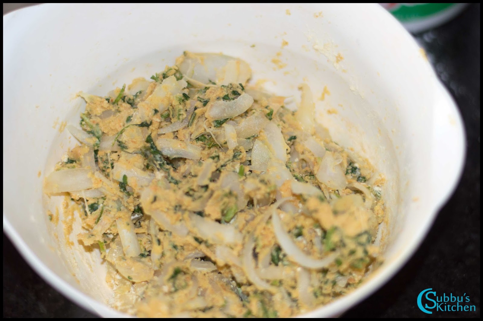 - Add onions, coriander leaves, curry leaves and mix well with hand. Do not add water. Try to mix the flours and coat them in the onions with hand pressure. If you feel very dry, just sprinkle very little water and mix well