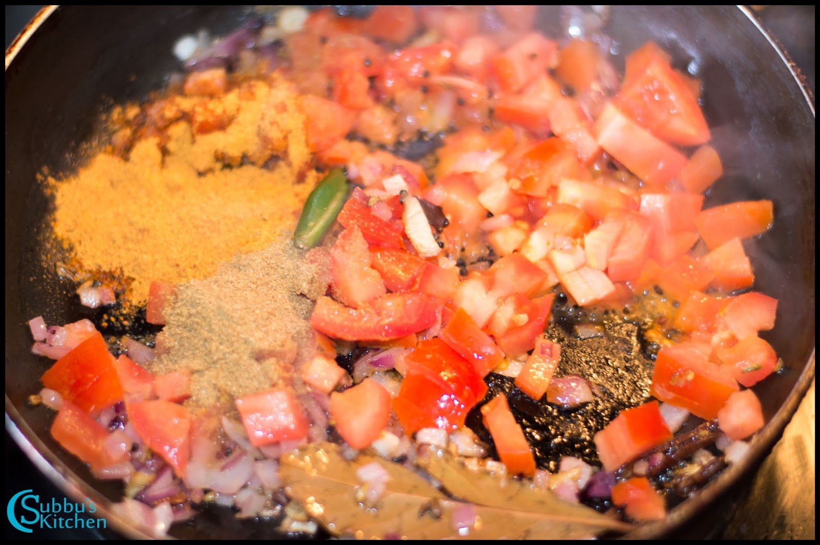 - Saute the onions till they are translucent. Then add finely chopped tomatoes to the pan. Along with the tomatoes, add the slit green chilli, coriander powder, sambar powder and give a good mix.
