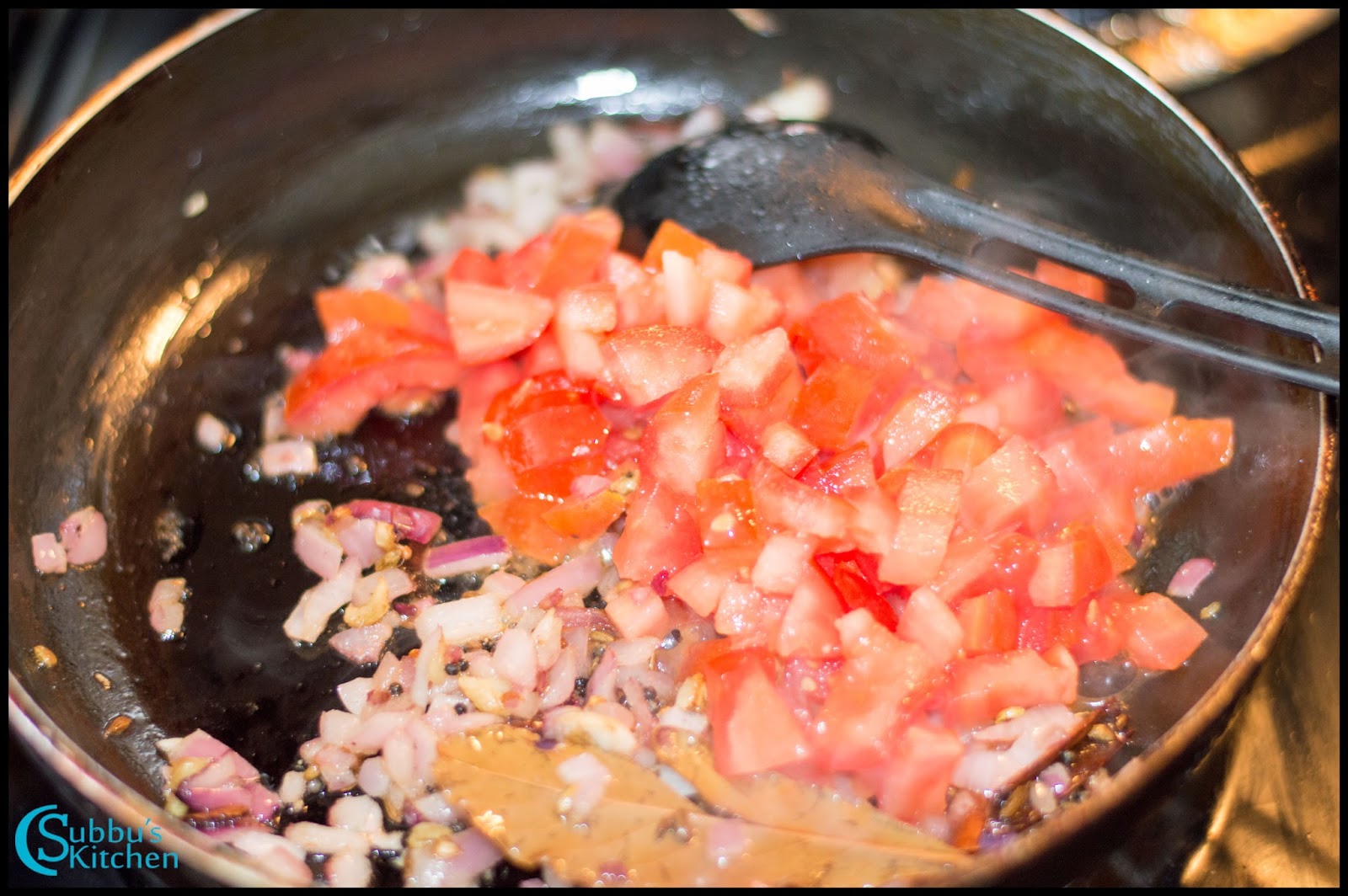 - Sauté the finely chopped onions in the pan until they turn translucent. This will take about 5 minutes. Then, add the finely chopped tomatoes and turmeric powder. Give everything a good mix and let the tomatoes cook until they soften and become mushy. This will take another 2-3 minutes.1 no Onion, 1 chopped Tomato, ½ teaspoon Turmeric Powder