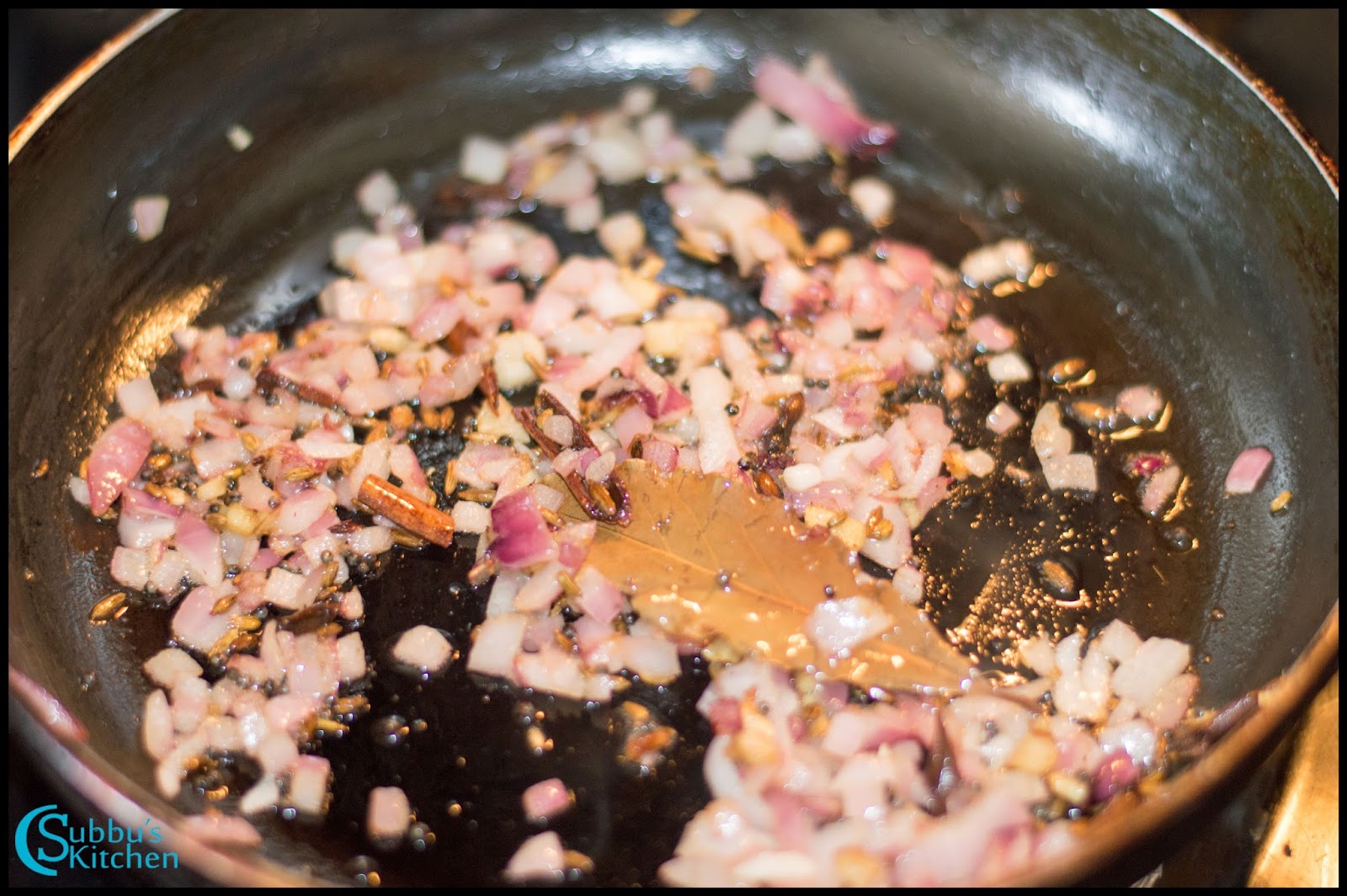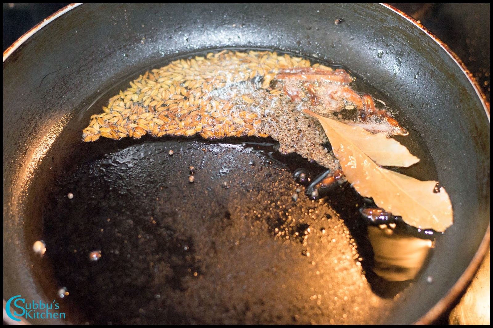 - Heat oil in a heavy-bottomed pan. Once hot, add the mustard seeds and fennel seeds. When the mustard seeds splutter, toss in the green chili, bay leaf, cinnamon stick, and cloves.Also add Curry leaves. Fry for a few seconds until fragrant.1 teaspoon Mustard Seeds, 1 teaspoon Fennel Seeds, 1 no Bay Leaf, 1 inch Cinnamon (Pattai), 2 nos Cloves (Krambu / Lavang), 1 slit Green Chilli, 1 spring Curry leaves, 2 tablespoon Oil