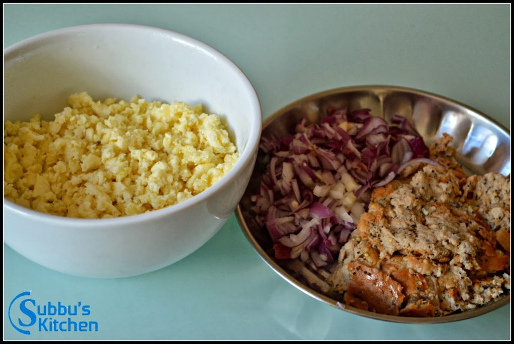 - I have used store-bought refrigerated Paneer. So first, kept it in microwave for a minute to bring it back to room temperature. Then I chop the paneer bar into bite size pieces and then crumbled them. Dip the bread in water and immediately remove them and squeeze it nicely and keep it ready. Also boil and mash the potatoes. Finely chop the onions. Mix the paneer, mashed potato, onions, wet bread, ginger-garlic paste and other masalas and mix well. Now our preparation part is done