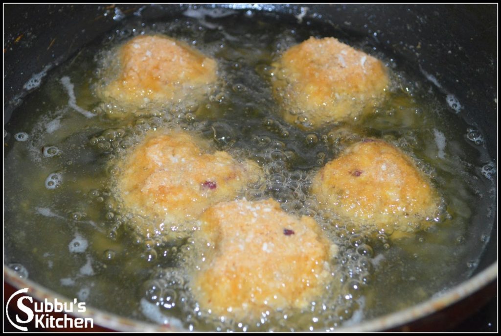 - Take out the coated patti from maida flour and coat it in the bread crumbs. Meanwhile, heat oil in a pan to fry the cutlet. When the oil is hot enogu, gently drop the coated cutlet in oil and fry them evenly till they become crispy and turns to golden brown color. Remove the fried cutlets and place it in a paper plate to drain the excess oil. Repeat this to fry cutlet in batches