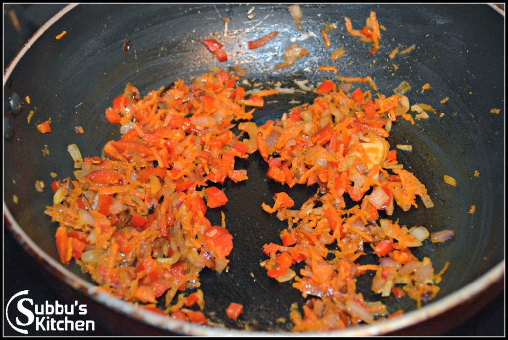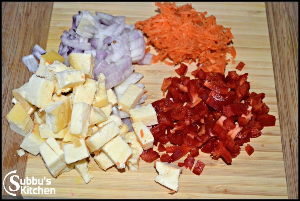 - Chop the onions and tomatoes. Wash, peel and grate the carrot. I have used the store bought paneer cubes. We can use the paneer cubes as such or we can also grate it. Heat oil in a pan, add chopped onions along with a pinch of salt. Saute the onions till they turn golden brown color