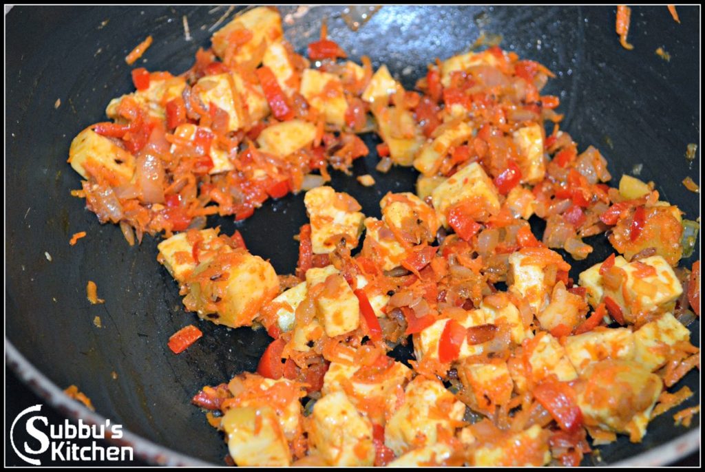 - Add chopped tomato, grated carrot and stir-fry till the tomatoes and carrots are cooked. Add turmeric powder, pepper powder, coriander and cumin powder and mix well. Add the paneer cubes and mix well. Adjust the salt. Now our Paneer filling is ready. Remove from flame