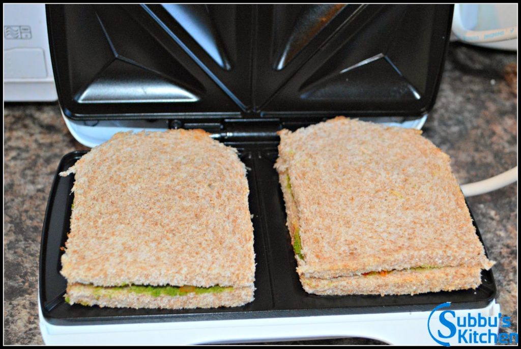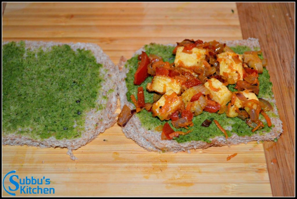 - Take 2 bread slices and chop their edges. Spread the green chutney on both the slices. Add 2 teaspoon of paneer filling on one slice of bread. Cover that bread with other slice with their green chutney spread facing down. Place the bread in the sandwich maker and toast it.