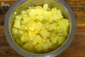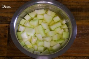 - Wash and peel the green papaya. Discard the seeds and chop the raw papaya into medium size cubes. Take the papaya cubes in a vessel. Add moong dal, pinch of turmeric and salt. Add 1 cup of water.
