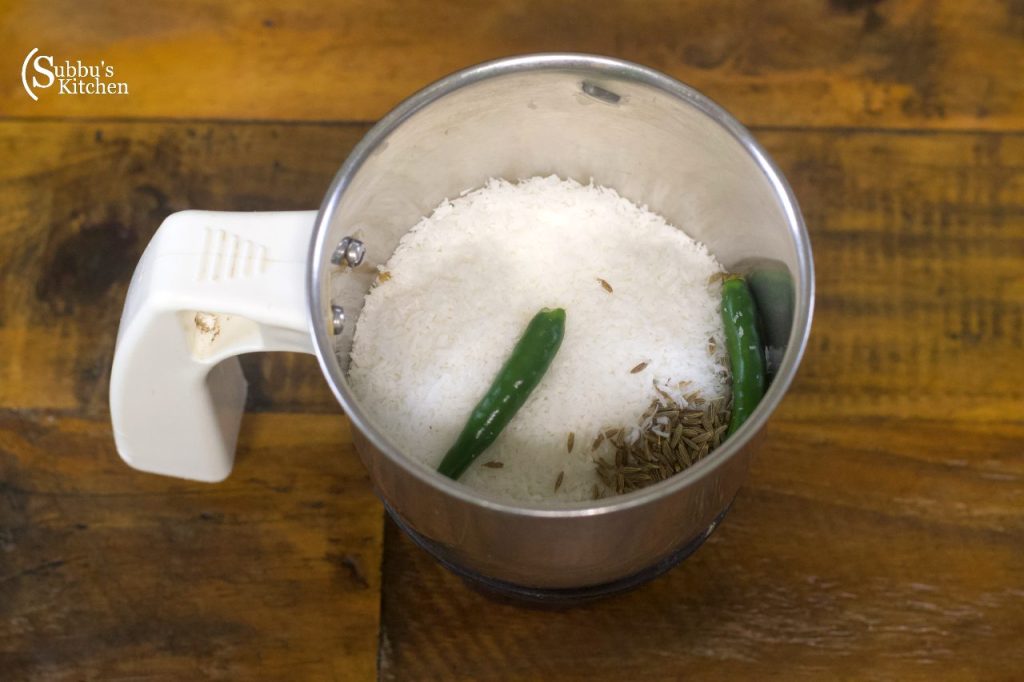 - Take grated coconut, cumin seeds and green chili in a mixer jar.