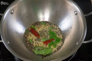 - Heat oil in a pan. Add mustard seeds and allow it to sputter. Next, add split urad dal and fry till light golden. Then, add red chili and curry leaves. Give a mix.
