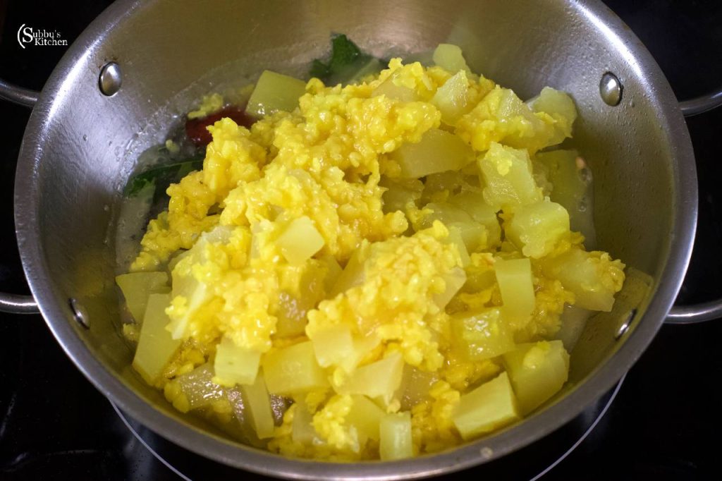 - Pressure cook the papaya and moong dal for 3-4 whistles.