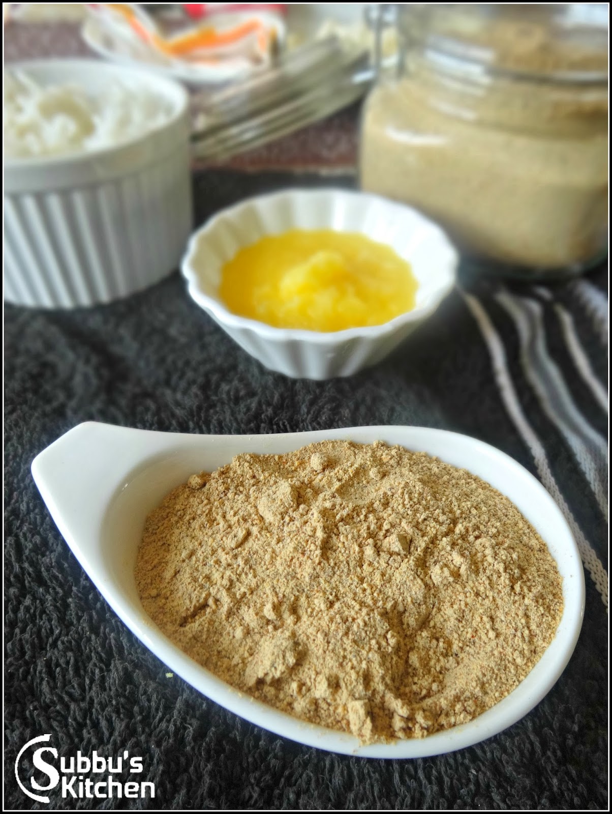 - Allow all the fried ingredients to cool off and then grind all these in a mixer along with jeera to a fine powder