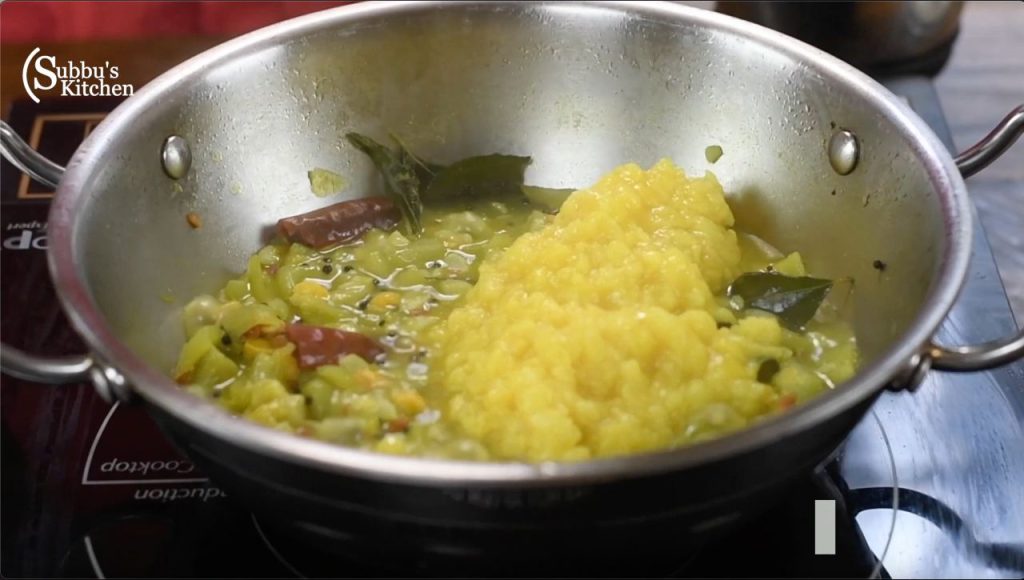 - When the ridge gourd is completely cooked, add the cooked dal.