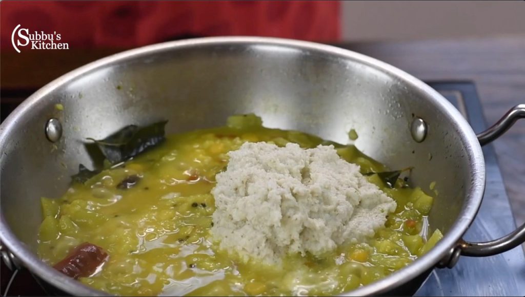 - When the ridge gourd is completely cooked, add the cooked dal and ground coconut paste.