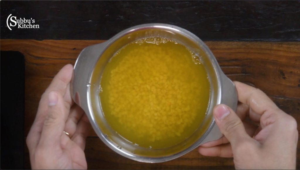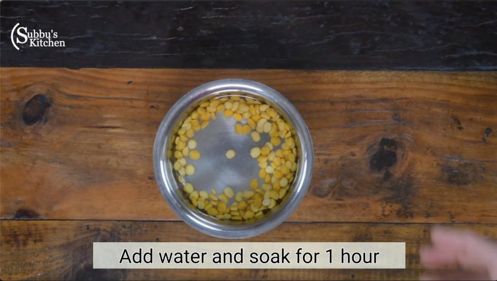 - Take the chana dal in a vessel. Add water and soak the dal for 1 hour.