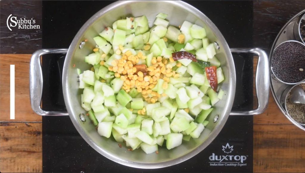 - Cover the pan with a lid and let the ridge gourd gets cooked.