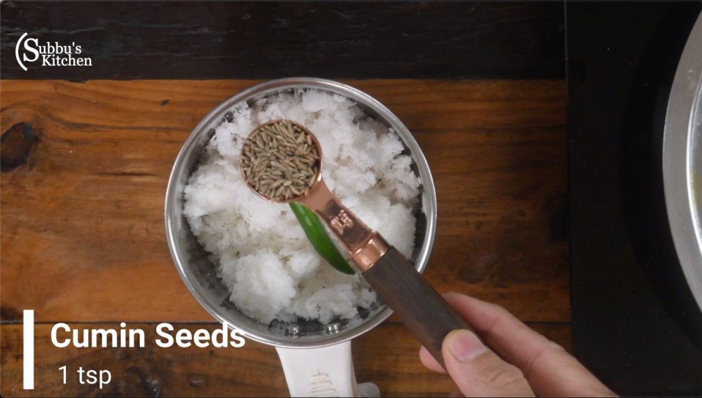 - Take the grated coconut, green chili and cumin in a mixer jar.