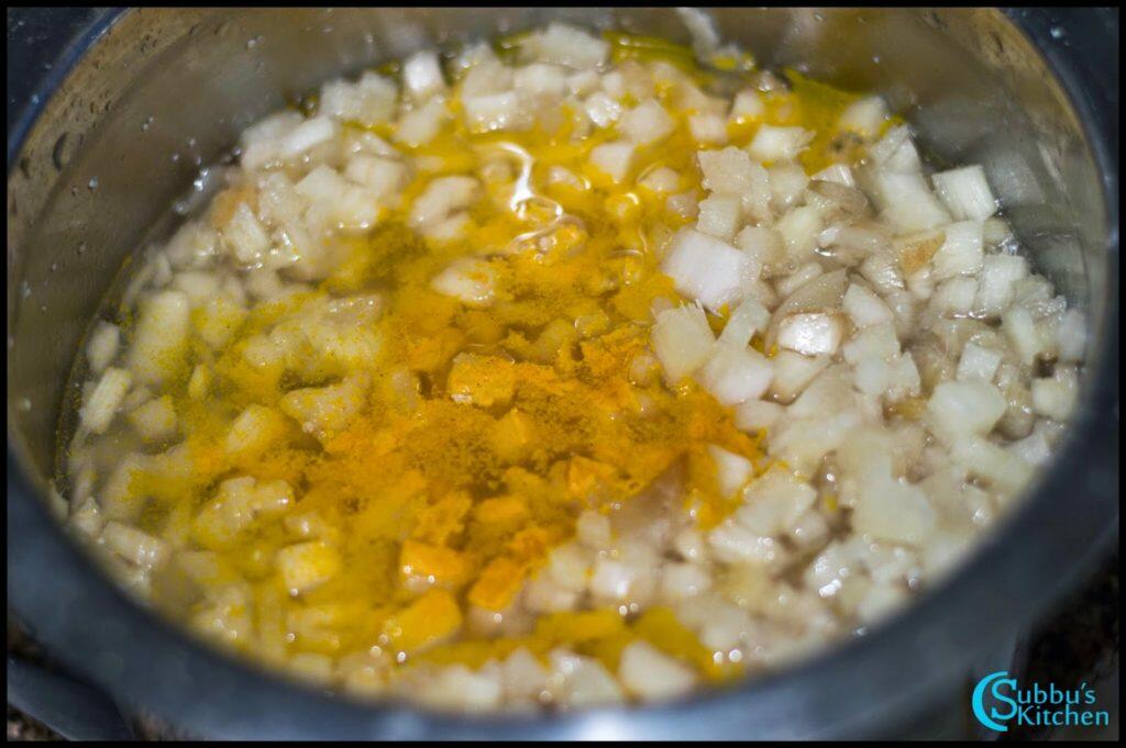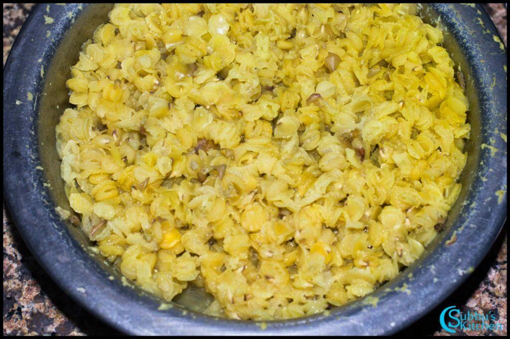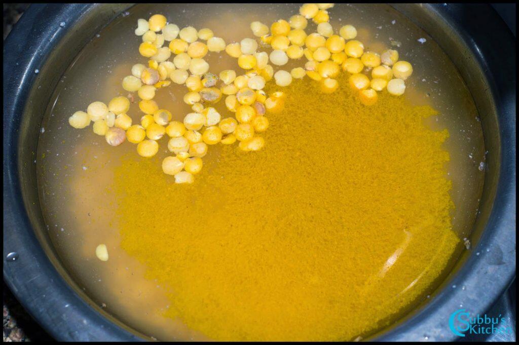 - Pressure cook the thurdal with a pinch of turmeric. Once cooked, mash the dal nicely and set it aside