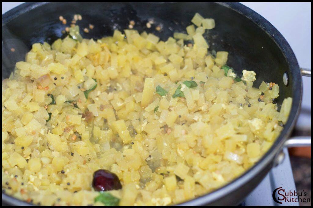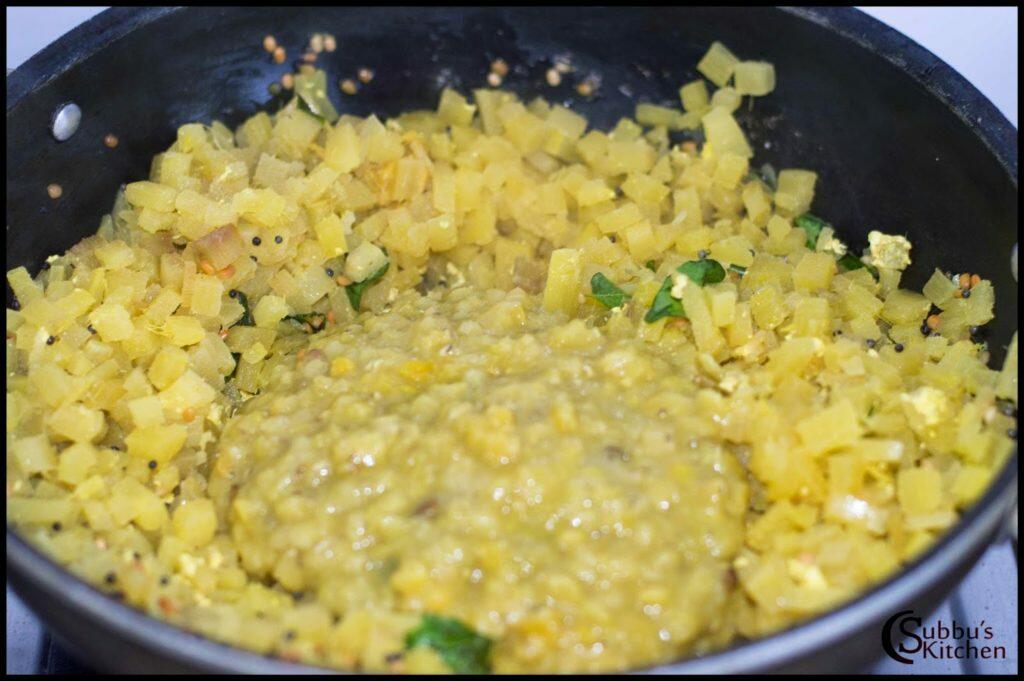 - Add the cooked plantain stem to the pan. Add the mashed dal to the pan and mix well
