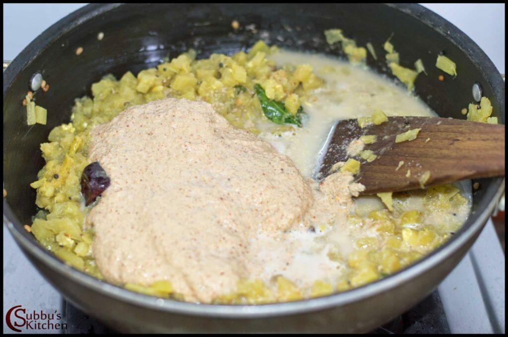 - Next, add the ground paste along with salt and mix well. Bring the stew to boil and then switch off the flame.