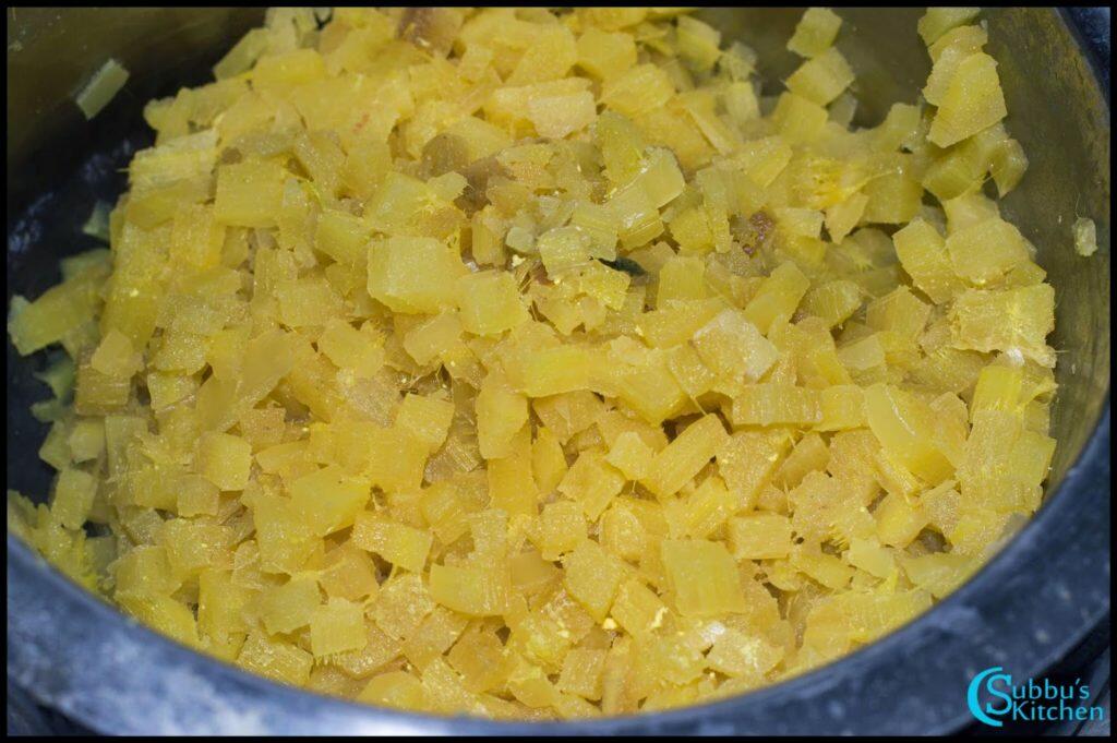 - I always prefer to cook the Plantain stem in pressure cooker as it will take more time to cook over gas top. Take the chopped plantain stem in a vessel and add turmeric powder and water. Place the vessel in the cooker and allow it to cook for 2-3 whistles. Once the plantain stem is cooked, allow the pressure to release and then gently remove from cooker and set it aside.