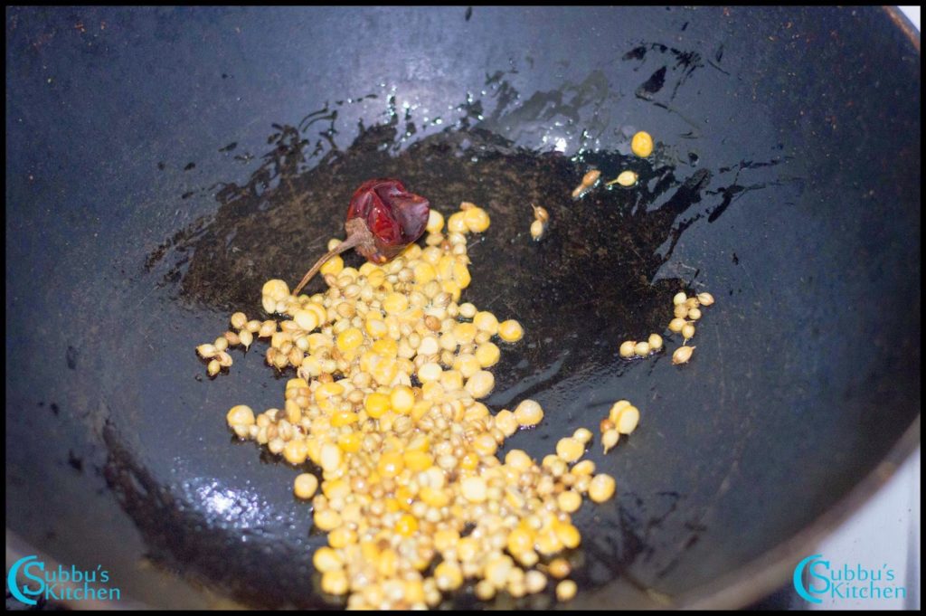 - Heat oil in a pan and fry the grinding ingredients other than coconut.