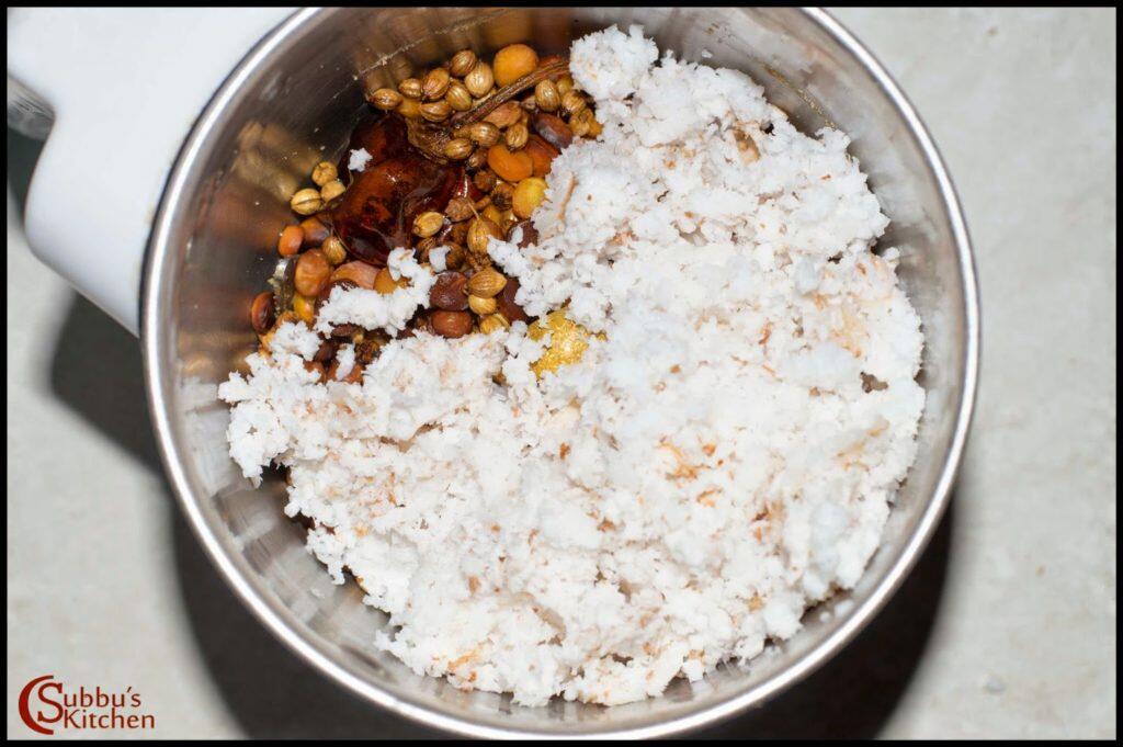 - Heat oil in a pan and fry the grinding ingredients other than coconut. Take these in a mixer and add coconut to the mixer