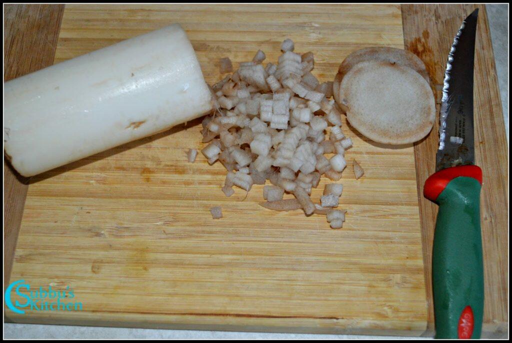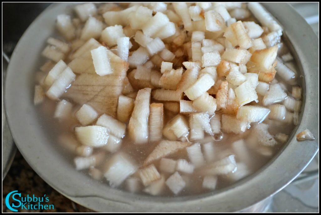 - Slice the disks into a smaller pieces and immerse the same in the butter milk and water mixture as this will preserve the original color of the stem otherwise this will turn out to be black in color